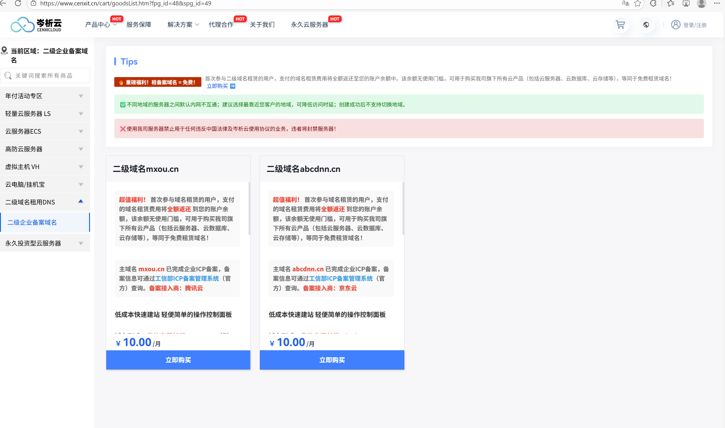 岑析云提供国内二级备案域名。免去注册域名和备案的复杂流程,购买即用。