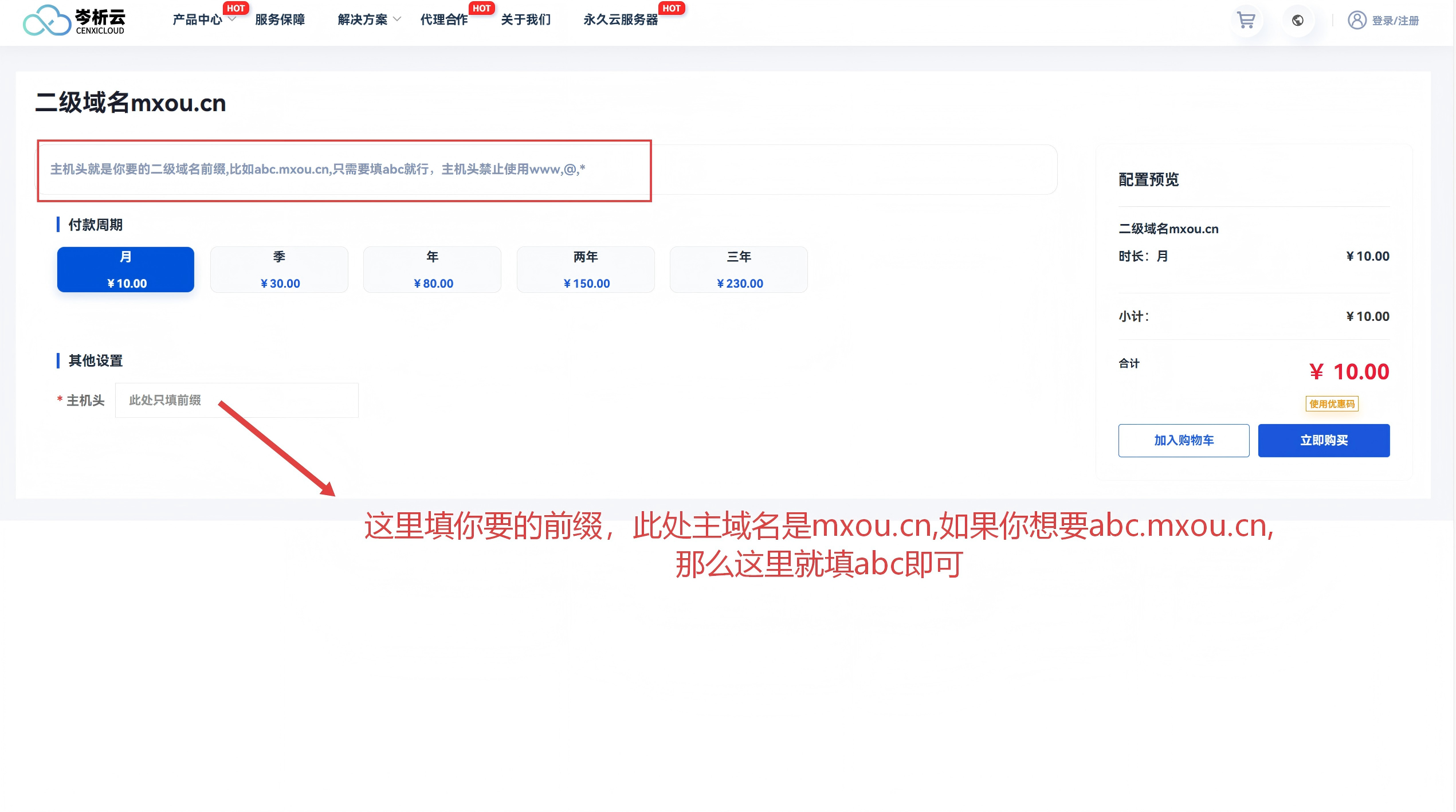 3. 提交订单支付:选择使用期限,完成支付,即时开通域名使用权;