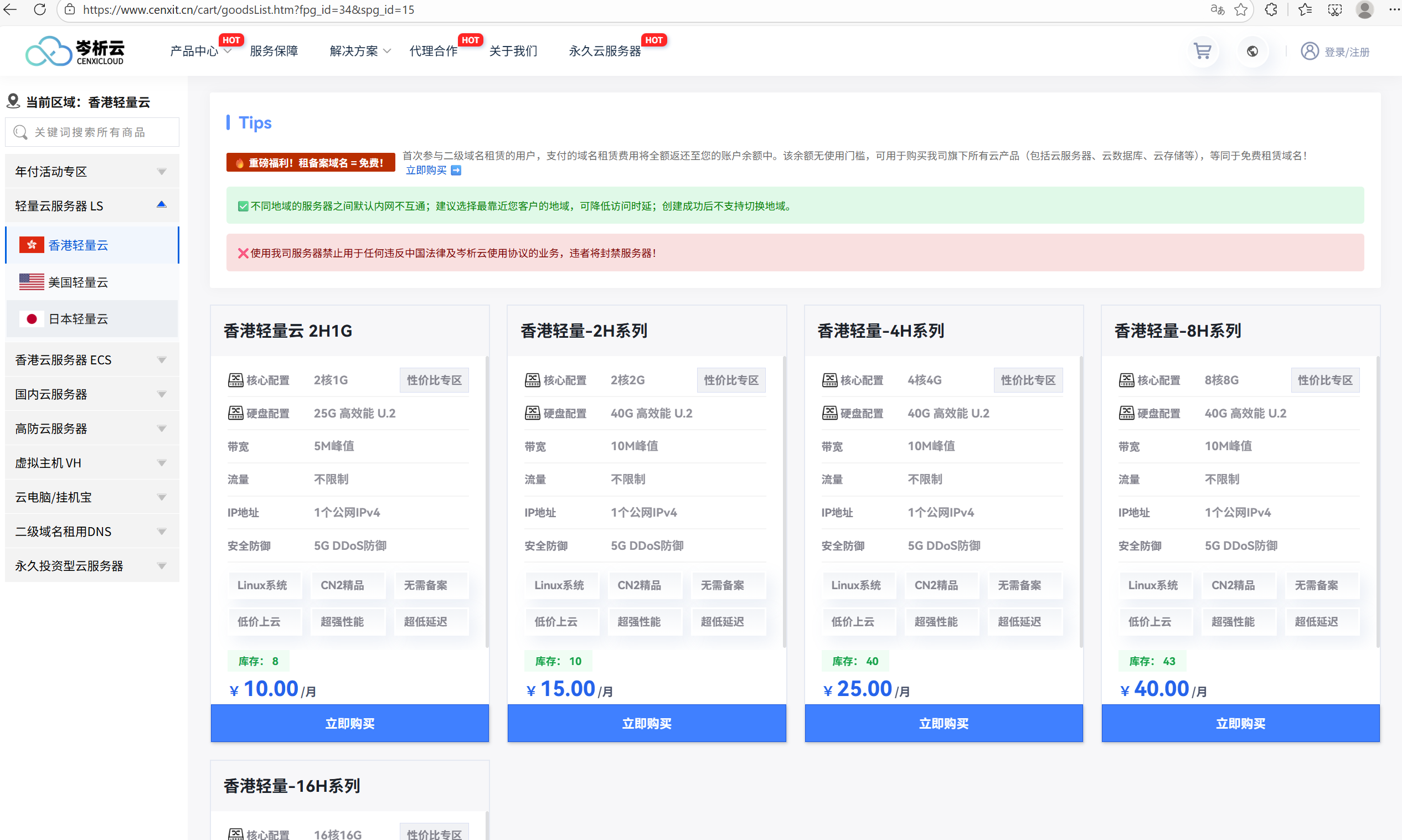 LS轻量云服务器适合新手,价格低但性能较弱。购买时选择区域和配置(推荐CentOS7.9/9或宝塔系统),同意条款后支付完成。