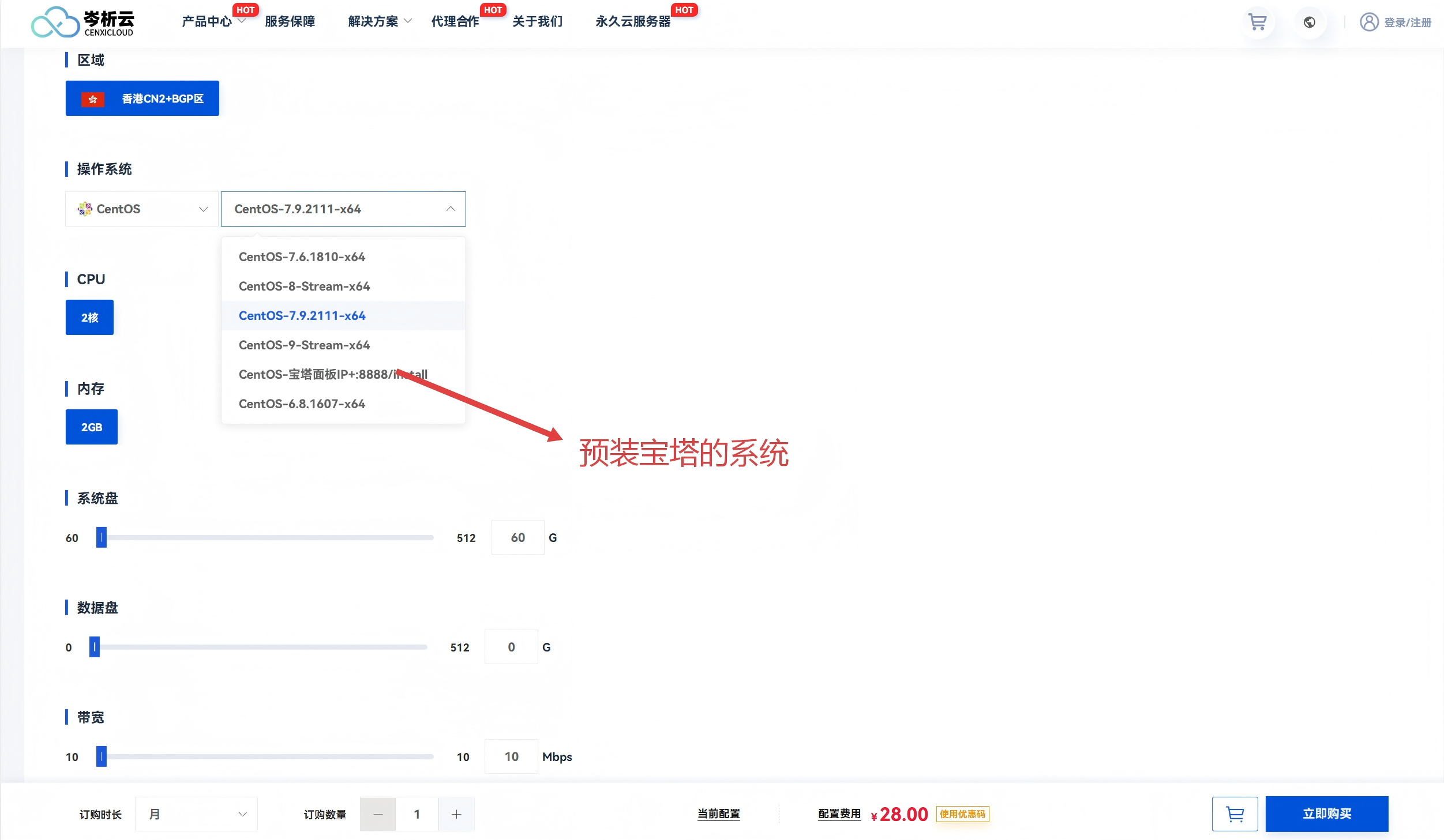 操作系统 建议新手选择Centos7.9 / Centos9 。如需预装宝塔面板就选择带有”宝塔”字样的系统安装即可