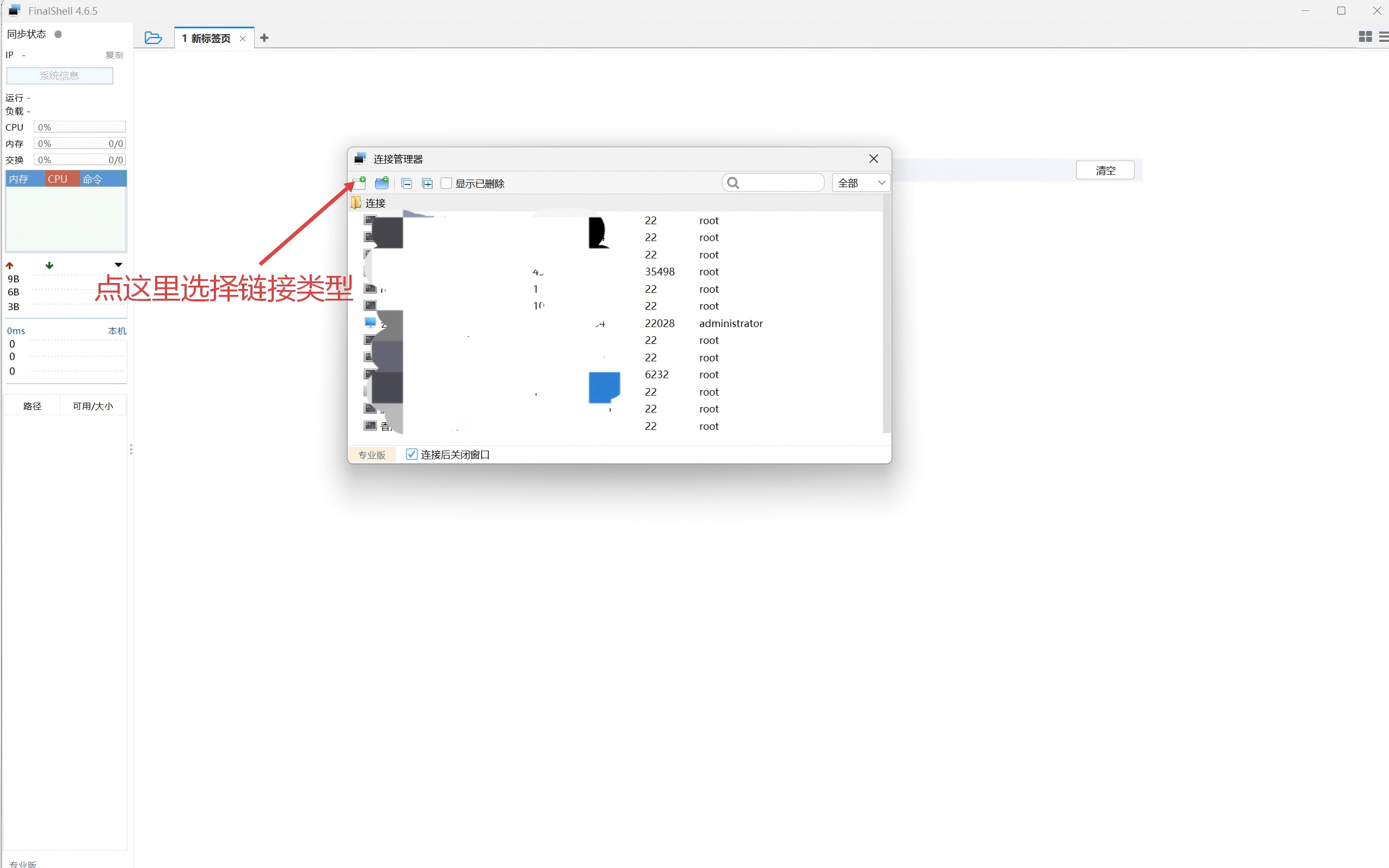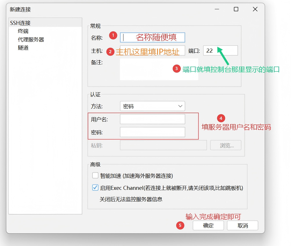 选择链接类型为SSH连接,这个工具支持SSH和Windows远程桌面,选择好进入下图,按图来填写服务器信息即可